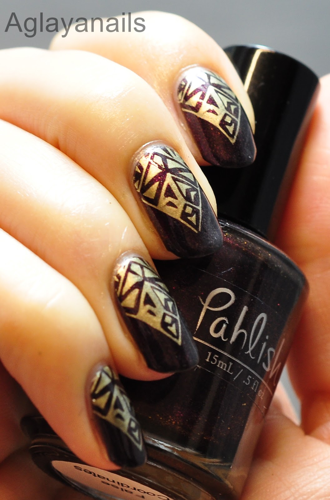 My base color is Pahlish False Coordinates, a deep read leaning purple polish with tiny gold flakie glitter. I used three coats for opacity.
